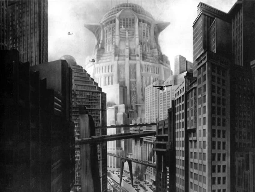 L’idea di girare Metropolis venne a Lang quando vide, per la prima volta, New York «notturna e scintillante di miliardi di luci» nel 1924. Lo skyline lo affascinò al punto tale che il visionario regista si spinse oltre ogni immaginazione, allo scopo di trovare soluzioni innovative per dare vita alla monumentale megalopoli. Per fortuna che prima di diventare regista, Lang era stato architetto. Da studente d’arte, decise di dipingere alcuni degli immensi scenari urbani; prese come riferimento le architetture futuriste di Antonio Sant'Elia e Mario Chiattone. Pur essendo pilastro del cinema espressionista, Metropolis scenograficamente ha precorso lo stile cyberpunk.