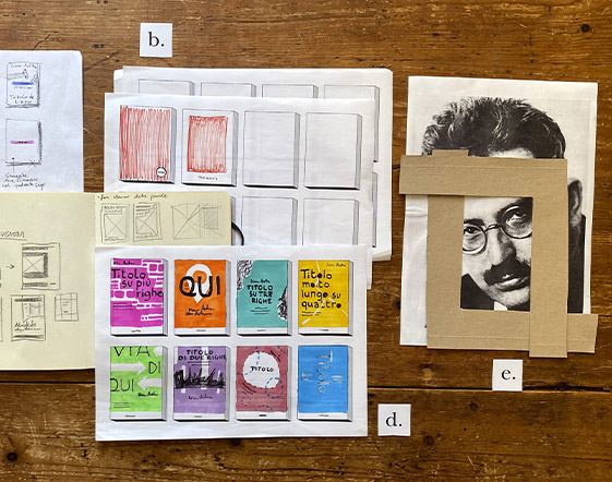 Studi di progetto. a. Prime prove di ritmo e variazione. Il marchio Treccani era pensato per vivere in un rettangolo colorato al centro della copertina. b. Quando progetto, mi stampo dei fogli A4 con delle piccole copertine bianche, poi scarabocchio dentro le varie idee per visualizzarle, scartarle, raffinarle. c. Ipotesi per il posizionamento del logotipo Treccani d. Gli ultimi bozzetti a mano della collana “Visioni”, prima di passare al computer. e. Due semplici squadrette di cartoncino mi consentono di studiare il taglio delle foto.
