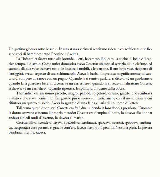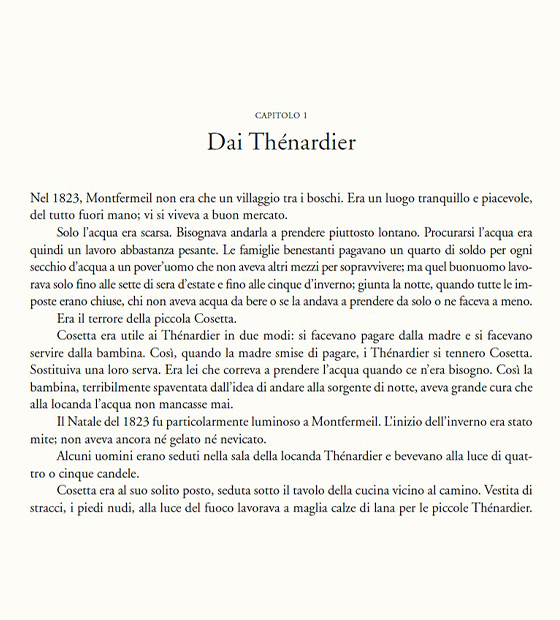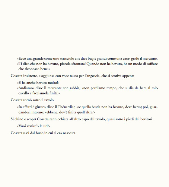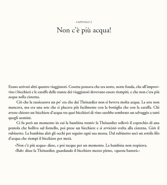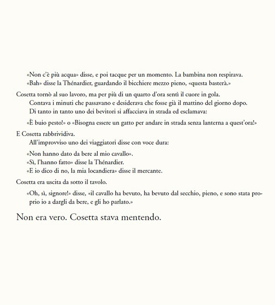 Cosetta passa le sue giornate aiutando nella locanda o lavorando a maglia. Guarda le due figlie dei Thénardier, trattate dolcemente dai genitori, giocare con bambole che lei non può toccare. Una sera, nella locanda, non esce più l'acqua dalla cisterna, e lei viene costretta, nonostante la sua paura del buio, a uscire per riempire un secchio alla fonte. Qui si manifestano tutte le sue paure, magistralmente impresse sulle pagine dal bravissimo illustratore Olivier Desvaux, ma a soccorrere la ragazzina appare un uomo, Jean Valjean, che la aiuta con il secchio.