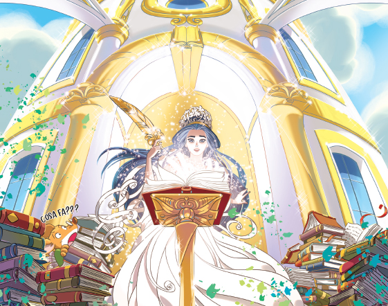 Alla fine della scalinata, davanti ai miei occhi si materializzò una grandissima terrazza, che svettava altissima su Topazia. Lo capii subito: mi trovavo in cima alla TORRE DELLE CORRENTI, il luogo dove Imaginaria era solita scrivere bellissime storie nell’aria con la sua Fantamatrix, la sua magica Penna d’Oro. Ogni giorno sussurrava: “Fantasia Sia!” e scriveva nell’aria idee immaginifiche…Poi le diffondeva nel mondo, dove ce n’era più bisogno grazie al Vento dell’Ispirazione