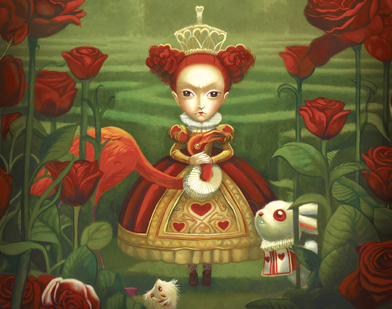 La rappresentazione della Regina di Cuori ne L'infanzia dei cattivi, ad esempio, evoca chiaramente quella di Alice nel paese delle meraviglie (L’ippocampo, 2021), che lui stesso ha illustrato. Riconosciamo l’acconciatura, il vestito. Nonostante non si menzionino animali, la vediamo reggere il collo di un fenicottero, ai piedi un coniglio bianco e un piccolo riccio dalla testa inclinata in maniera insolita. A fare da cornice un cespuglio di rose rosse - meno una, in parte bianca. Se abbiamo letto il testo originale, tutti questi dettagli non passeranno inosservati, arricchendo l'esperienza di lettura e stimolando la curiosità di approfondire anche i personaggi meno noti.
