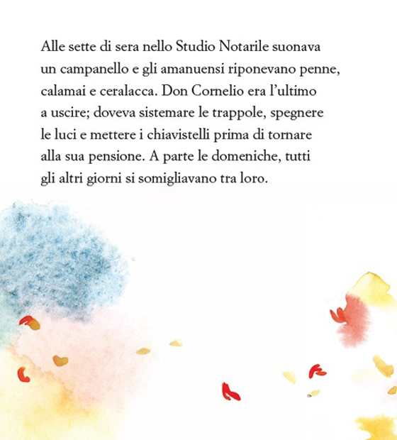 All’ora di pranzo, il nostro archivista va a mangiare un panino al formaggio in una piazza che dista 91 passi dallo studio del Notaio. Lo sa perché li ha contati. Don Cornelio è soddisfatto della vita di piccole cose che conduce, finché, un giorno d’autunno, andando a prendere il tram, Cornelio scorge in una vetrina una statua di porcellana e... devo interrompermi qui, perché il resto della storia è spazio di sogno e mistero, e tutto vorrei tranne che rovinarvela.