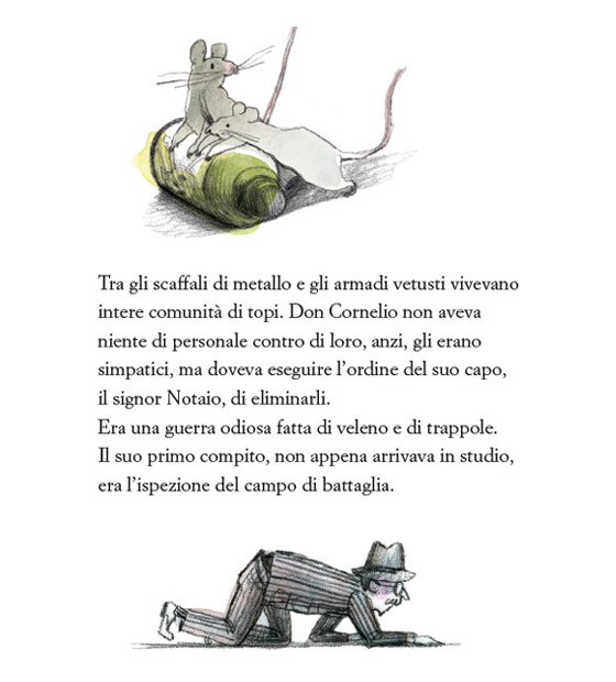 Nella stanzuccia in cui Don Cornelio lavora ha suo alloggio una comunità di topi, e Cornelio, per ordine del suo capo, il Notaio, ha l’ordine di eliminarli e fa loro una guerra odiosa, a colpi di trappole, veleno, colla. Don Cornelio svolge questo compito con estremo dispiacere, a lui, in realtà, i topi non danno fastidio.