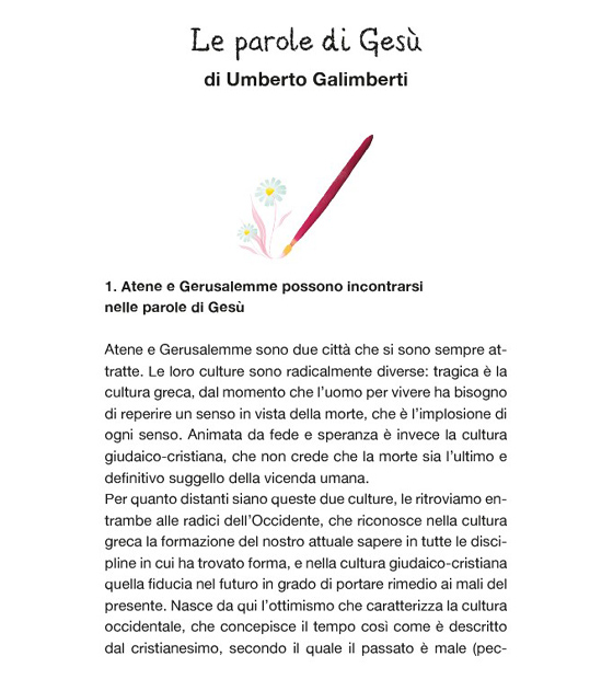 La prima cosa che mi viene da pensare avendo in mano questo libro è chiedermi se sia giusto leggere un libro che narra le vicende di Gesù anche se non si è credenti e, più che altro, se è giusto farlo leggere ai nostri figli o alle nostre figlie? Le parole di Gesù di Umberto Galimberti e Ludwig Monti edito Feltrinelli, è un libro che non mostra un Gesù intento a creare una nuova chiesa, ma una persona che ha lanciato dei messaggi oggettivamente giusti.