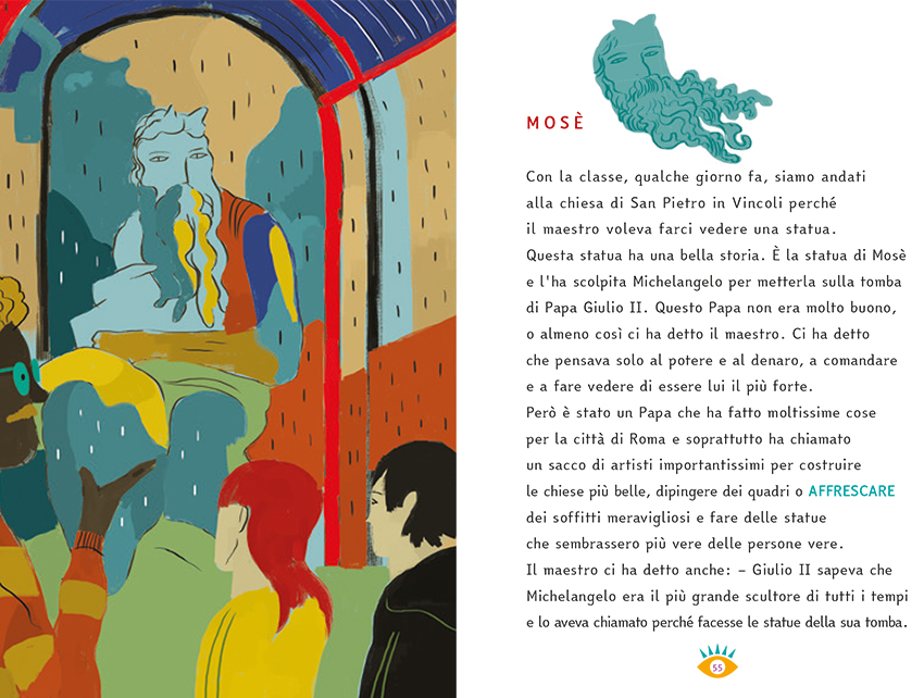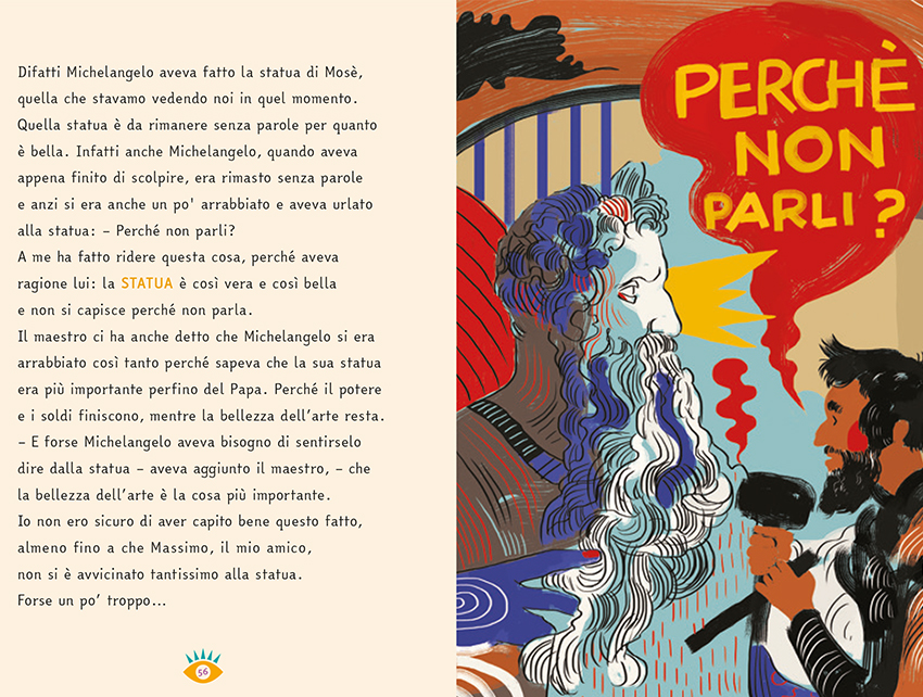 Una scolaresca viene portata dal proprio maestro a San Pietro in Vincoli, a Roma, per vedere e ammirare la statua di Mosè, scolpita da Michelangelo su commissione di Papa Giulio II. Si racconta che, appena finito di scolpirla, Michelangelo si arrabbiò, urlando alla statua "Perché non parli?". "A me ha fatto ridere questa cosa, perché aveva ragione lui: la statua è così vera e così bella e non si capisce perché non parla".