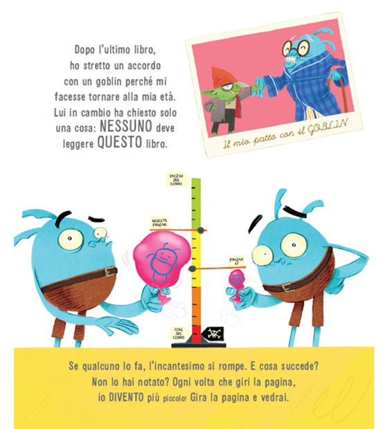 Nella sua precedente avventura aveva stretto un patto magico con un Goblin per ritornare alla sua età ma, in cambio, ha chiesto che nessuno aprisse questo libro che ci troviamo in mano! Ma la tentazione è troppa, non resistiamo, e quindi voltiamo la pagina e... effettivamente ci accorgiamo che il nostro amico assume dimensioni più piccole e che quindi l'incantesimo è rotto!