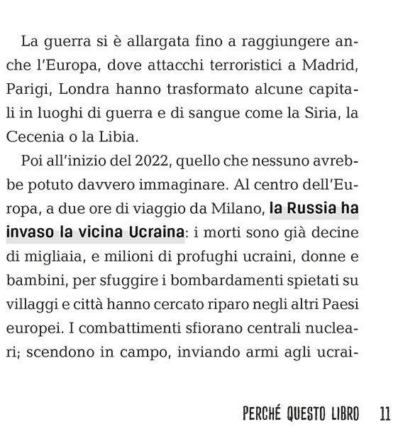 La guerra viene così conosciuta come una ricercatrice di nemici che spesso sono tutto fuorché tali. Perché si combatte? Cosa spinge le persone a essere le une contro le altre? L’autore lo spiega bene attraverso le parole che sceglie – fanatismo, paura, vittoria – perché anche questo conta. Il vocabolario che uno sceglie, ciò che viene detto per influenzare un pensiero, per dare in pasto alle persone un nemico utile con cui avercela, ed eseguire per il proprio Stato tutto ciò che pretende, senza porsi domande. È quello che accade oggigiorno in Russia, un Paese in cui non esiste altra legge al di fuori della persona che la governa, che non accetta altri che possano pensarla contrariamente a lui. Ecco che il nemico ha preso forma, e non si sa perché. È solo accettare e applicare un ordine.