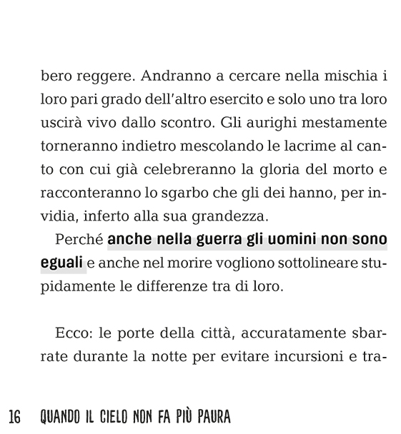 Una delle grandi riflessioni che vengono fatte nel libro è quella della differenza fra eroi, guerrieri, soldati e civili. Appartenuti a epoche diverse, ciascuno con un’identità ben precisa – l’orgoglio nel fare la guerra a cambiare i tratti di ciascuno. Nell’antichità si combatteva con maggior valore, per attestare la propria presenza nella società, ma questo non toglieva la sofferenza di perdere membri di una famiglia, di ritornare a casa e non sentirsi gli stessi. Quirico fa una riflessione anche sul racconto di quelle figure che scrivono, riportano le vicende – chissà se Omero stesso non è stato un vero e proprio giornalista che si è imbattuto nelle epopee incredibili, ma pur sempre gesta eroiche non prive di sangue e perdite. E nelle vicende scelte dall’autore – dalle più remote alle più recenti – in comune c’è sempre l’orrore. Fuori dal motivo scatenante, fuori dalle situazioni, a prescindere dai territori. C’è la morte e l’inspiegabile, c’è sempre un nemico da combattere, che nemico non è.