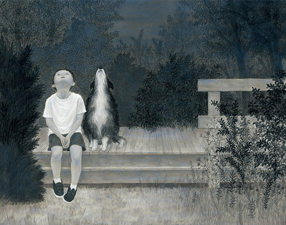Ma manca ancora una cosa per rendere questa giornata estiva davvero perfetta: il bambino e il suo cane sono seduti fuori e, alzando entrambi gli occhi al cielo, rimangono ammutoliti: un’esplosione di stelle sulla coperta blu del cielo. Di fronte a uno spettacolo così possono solo rimanere con il naso all’insù, senza stancarsi mai, lasciandosi andare alla poesia della splendida serata di Un'estate.