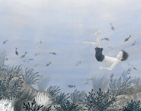 Ma che vacanza al lago è se non ci si tuffa tra le acque tranquille e cristalline? Ed ecco che il giovane escursionista non resiste e l’immagine del tuffo in mezzo al lago con gli spruzzi d’acqua lascia davvero senza parole, mentre le pagine si tingono un po’ di blu! L’incontro con i pesci nei fondali marini infonde un senso di pace e leggerezza e per il protagonista è sicuramente anche una bella conquista.