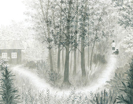 Sfogliando man mano le pagine, notiamo il bel panorama che il bambino vede dalla finestra della casa: il piccolo rimane lì a osservarlo, poi, colmo di voglia di scoperta, di avventura e autonomia, parte con il suo cane per esplorare il bosco che tanto lo affascina.