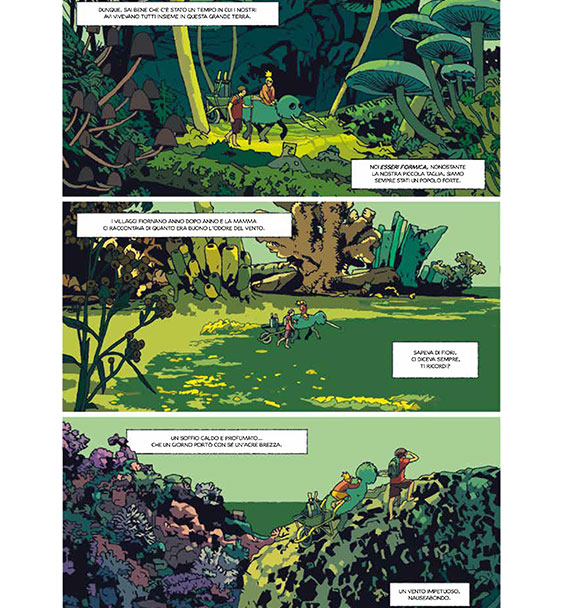 A grandi linee, la storia potrebbe essere riassunta così: anni fa, un virus misterioso (ma Starace giura di aver cominciato a pensare a questa storia prima del manifestarsi del Covid... e vista la grandissima attenzione profusa alla realizzazione del fumetto, c'è da credergli) ha fatto strage degli uomini formica, creature in tutto e per tutto simili a noi tranne che nelle dimensioni. Ma questi uomini, alti poco più di una falange, hanno trovato la salvezza in un antidoto piovuto dal cielo... anzi, piovuto dalle mani di esseri montagna, creature gigantesche alle quali gli uomini formica hanno continuato a guardare, da allora, come si guarda agli dèi.