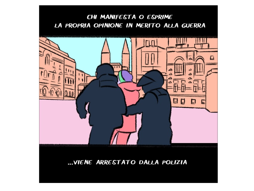Activatica, un’organizzazione di attivisti russi, mostra così il clima che si respira nella Russia di oggi: anche solamente due parole sono sufficienti per essere portati via dalla polizia. È repressione. Repressione di ogni dissenso nei confronti di un'invasione che tanta parte della società civile russa percepisce come ingiusta.