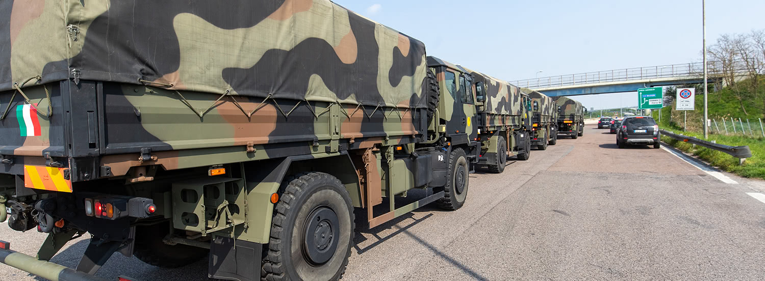 Se non vado sbagliando, dal 1945 ad oggi l’unica immagine di guerra in Italia che abbiamo è quella colonna di camion militari che nella notte trasportano furtivamente centinaia di cadaveri di abitanti della Val Seriana (Bergamo) perché siano inceneriti nei cimiteri ancora disponibili nel nord Italia. Non era una scena che si doveva vedere, avrebbe fatto solo paura.