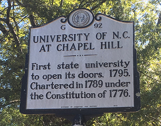 Fondata nel 1789, è stata la prima università pubblica americana. Il campus di Chapel Hill – una popolazione studentesca di oltre trentamila studenti e quattromila docenti – è la flagship, la nave portabandiera.