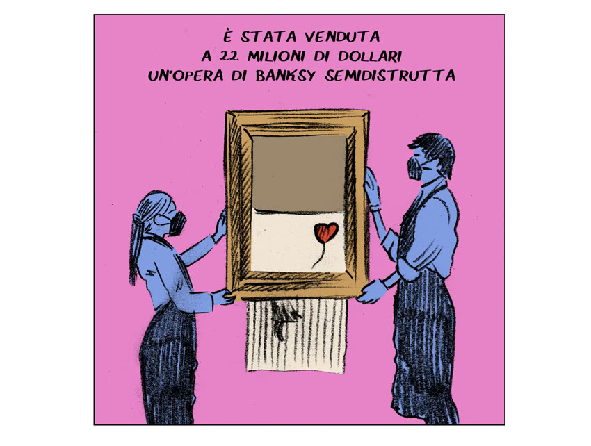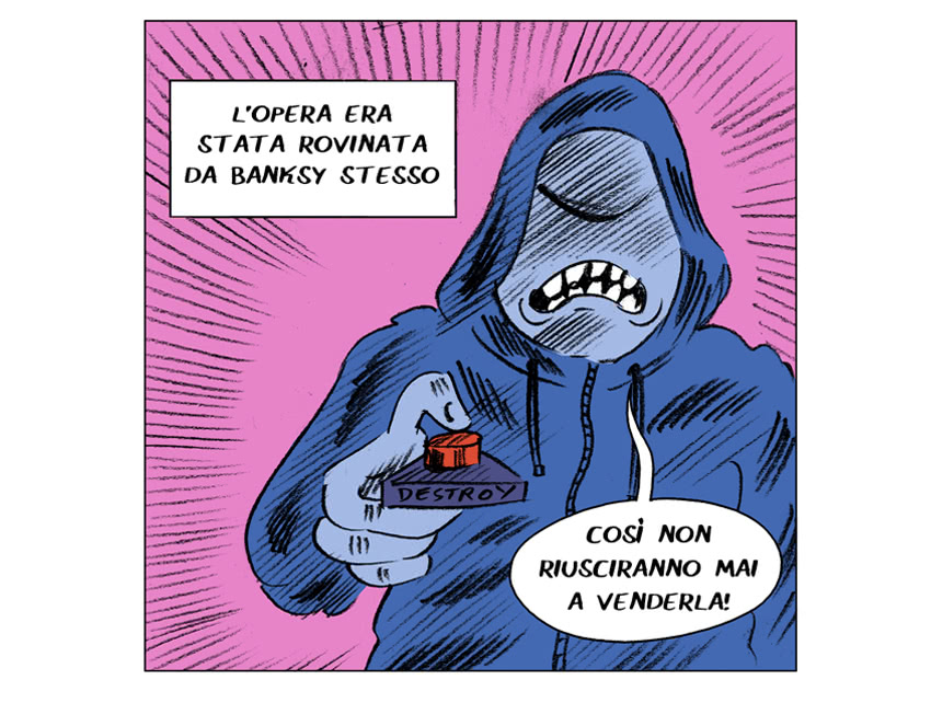 Un tritadocumenti nascosto nella cornice di un quadro che andrà all'asta e - voilà! - davanti agli occhi stupefatti di una platea di ricconi fino a quel momento piuttosto annoiati, la "ragazza col palloncino rosso" dipinta con una bomboletta spray dalla primula rossa di tutte le performance artistiche più sovversive si trasforma in una trafila di spaghetti alla chitarra.