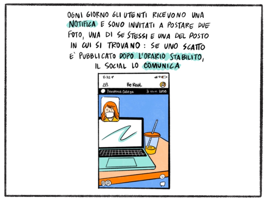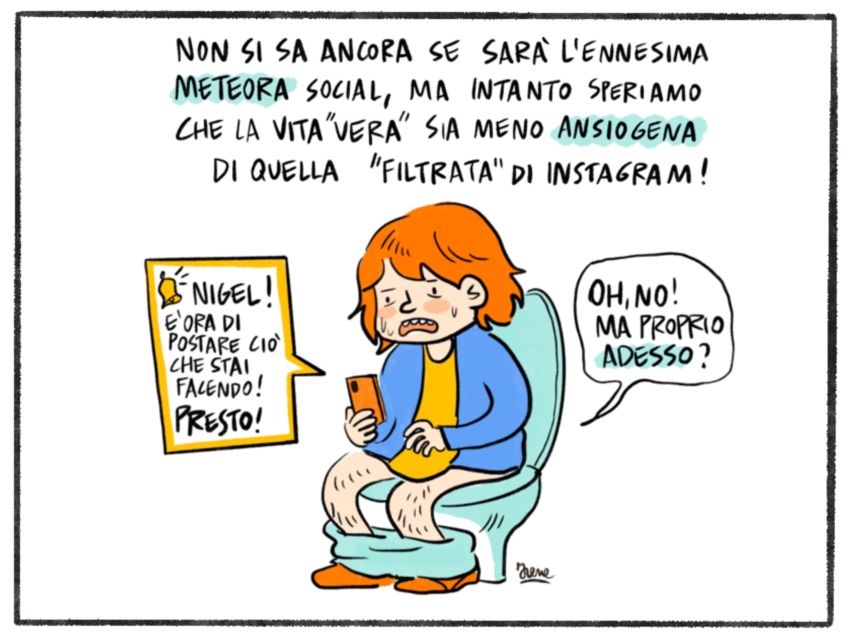 Visto il brevissimo intervallo a disposizione per scattare, comunque, BeReal più che un vero social network sembra essere una gara a tempo, speriamo solo che il "pronti, partenza... via!" non arrivi in momenti... ehm... un po' troppo privati, come sembra paventare la vignetta della nostra Irene.