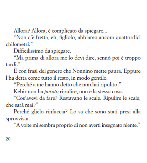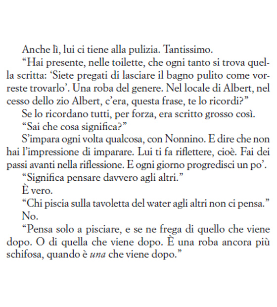 Perciò, mentre leggiamo che Nonnino taglia un orecchio al povero Iuc, o che Maracuja ha una voglia matta di ammazzare Alice, ma poi finisce con lei ad aggiustare una panchina perché i clochard abbiano un posto dove vivere, o che Benjamin fa di mestiere il capro espiatorio, noi lettori siamo in grado di dire: ma tutto questo ha perfettamente senso. Ed è, credo, uno dei grandi pregi di Pennac, riuscire a far sospendere l’incredulità a chi lo legge. Anche a chi lo fa per la prima volta, e si trova talmente coinvolto in questa confusione così vitale, così assurda, da non poter credere che sia tutto frutto di un’immaginazione.