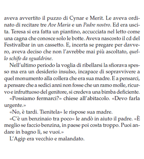 Centoquaranta. Centocinquanta. Centosessanta. Centosettanta. La Fiesta, disperata, impazzita, lanciata a centottanta all’ora, cercava di raggiungere il punto in cui il temporale infuriava più violento. «Papà...» tentò Niccolò. «Dimmelo. Ti lasci accadere?» ripeté; era così calmo da terrorizzarlo. «Papà, finiscila!» «Devi venire con me, Niccolò. Devi venire con me e devi dirmelo.»