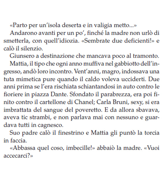 Il suo nome era Riccardo Giordano, aveva trentasei anni e quella notte, in quel momento, aveva davanti a sé i corpi di ciò che era stato in vita. Di chi era stato tutte le volte che era cambiato. E adesso, per uccidere le versioni di cui non reggeva più il peso, stava per uccidere quel che era oggi. Stava per spararsi un colpo in testa. Quindi posò l’indice sul grilletto della pistola e si preparò a morire