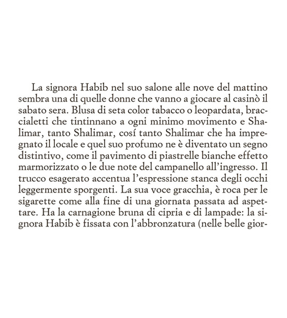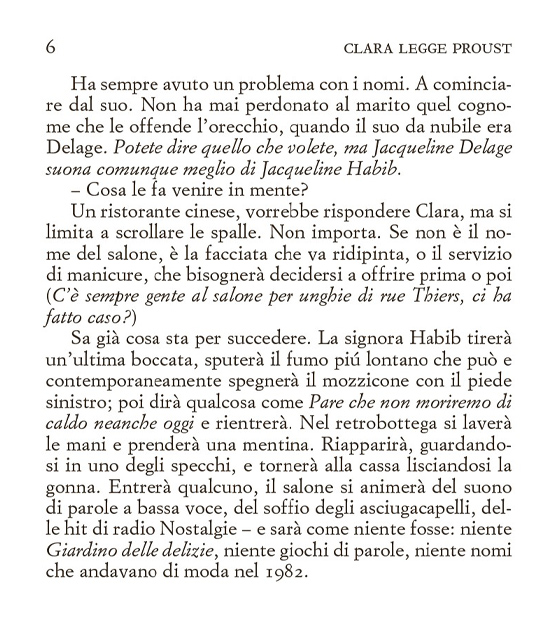 Clara non legge molto, non ha gusti letterari definiti e nel suo scaffale si possono trovare la biografia di Ibrahimović o libri sull’oroscopo. Non ha realmente degli hobby e sono anni che la sua vita è monotona, senza alcun particolare risveglio emozionale. Si alza la mattina, cerca di accarezzare il gatto che non ha mai ricambiato il suo affetto, si reca al salone in cui lavora tutto il giorno ascoltando battibecchi e chiacchiericci di vecchie signore, per poi tornare a casa da un fidanzato verso il quale non riesce più a provare attrazione.