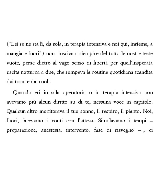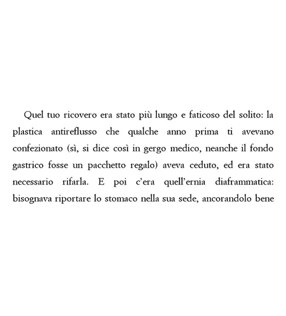 Per lungo tempo ho pensato che la mia malattia fosse incompatibile con la tua, che i nostri corpi malati non potessero convivere e, soprattutto, che non potessero parlarsi. Invece ogni comunicazione continua a passare attraverso il corpo, anche se malato. Anzi, oso dire in virtù del suo essere malato.