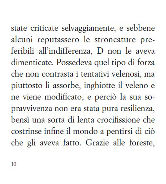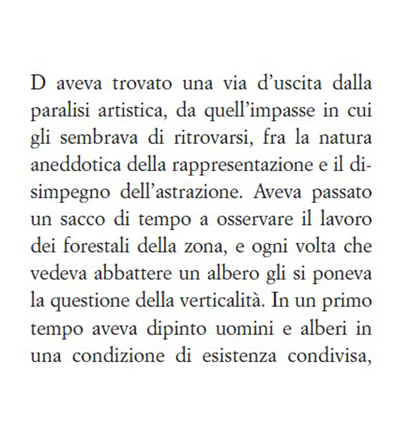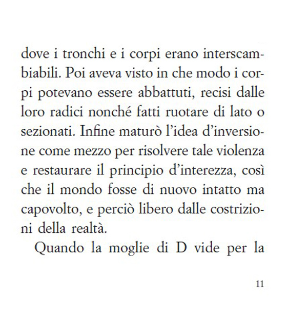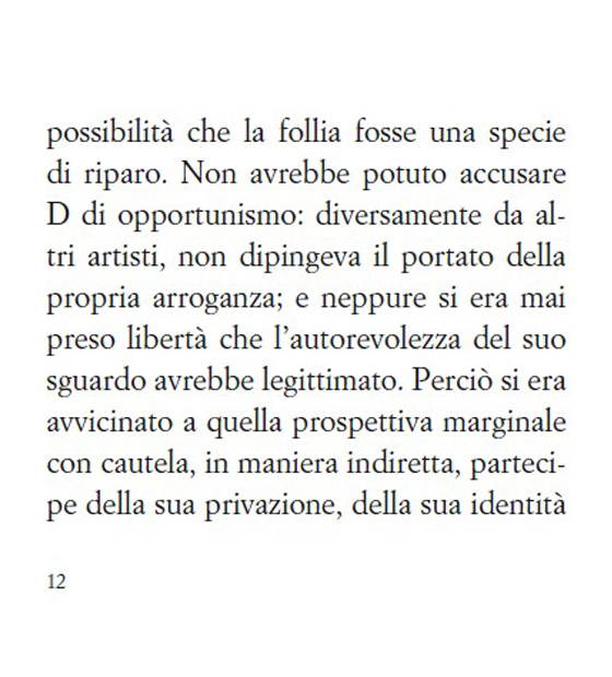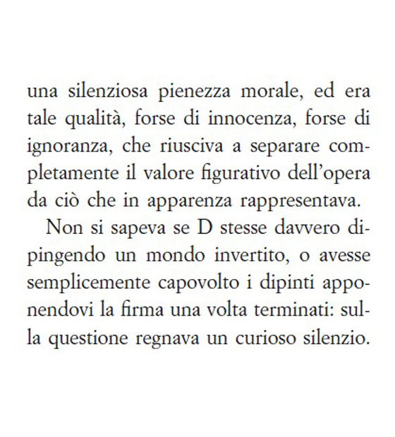 L’autrice racconta un’esperienza di distacco dalla realtà, dopo un’aggressione subita, come se il suo doppio – caro tema dell’arte – prendesse vita lì, in tutta la sua oscurità, in tutto il suo chiedere spazio e differire dalla forma vivente della sua essenza. Come se la sua controfigura fosse stata colta all’improvviso da quella violenza, dalla sua impossibilità di previsione e vibrasse nella forza di questo atto.