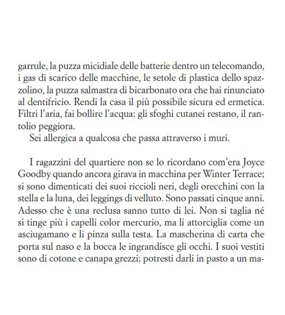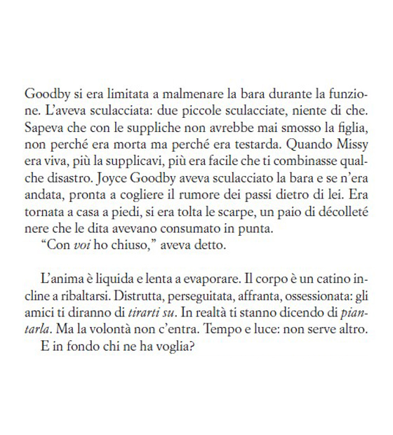 «Era un pensiero che ogni tanto gli passava per la testa ultimamente. Non era dolore, che avrebbe potuto travolgerlo in ogni momento, che come l’acqua piegava tutte le righe dritte e sbalestrava qualunque suo strumento di navigazione rendendolo inutile, bensì un pensiero razionale, distaccato: Non è orribile quello che mi è successo uno, due, tre mesi fa? È stato bruttissimo doverlo affrontare.»