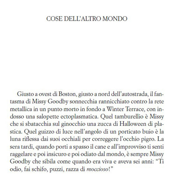 Giusto a ovest di Boston, giusto a nord dell’autostrada, il fantasma di Missy Goodby sonnecchia rannicchiato contro la rete metallica in un punto morto in fondo a Winter Terrace, con indosso una salopette ectoplasmatica