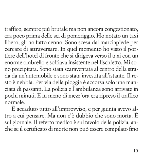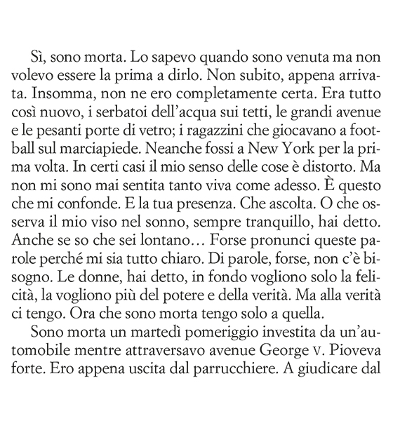 Sono morta un martedì pomeriggio investita da un’automobile mentre attraversavo avenue George V. Pioveva forte. È accaduto tutto all’improvviso, e per giunta avevo altro a cui pensare