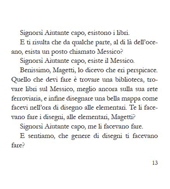 Tutto ha inizio ad Asti nel febbraio del 1944, dove Cesco Magetti presta servizio alla Guardia nazionale repubblicana Ferroviaria, nella Repubblica di Salò. Da buon soldato fascista obbedisce all’ordine impartito dal suo superiore (ma che ha origine molto in alto, tra le fila delle gerarchie naziste) di ricostruire la mappa della linea ferroviaria del Messico, a oltre 10000 km di distanza. Attraverso una scrittura magistrale, questo è il pretesto per dar vita a una realtà che di fatto potrebbe esistere senza Cesco Magetti e le sue avventure.