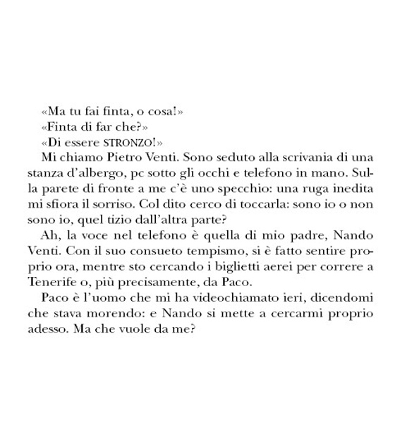 Il libro di Enrico Galiano inizia con una telefonata. Pietro, professore universitario di mezz’età, è in vacanza con moglie e figlio quando riceve la notizia: deve partire per Tenerife, e deve farlo in fretta.