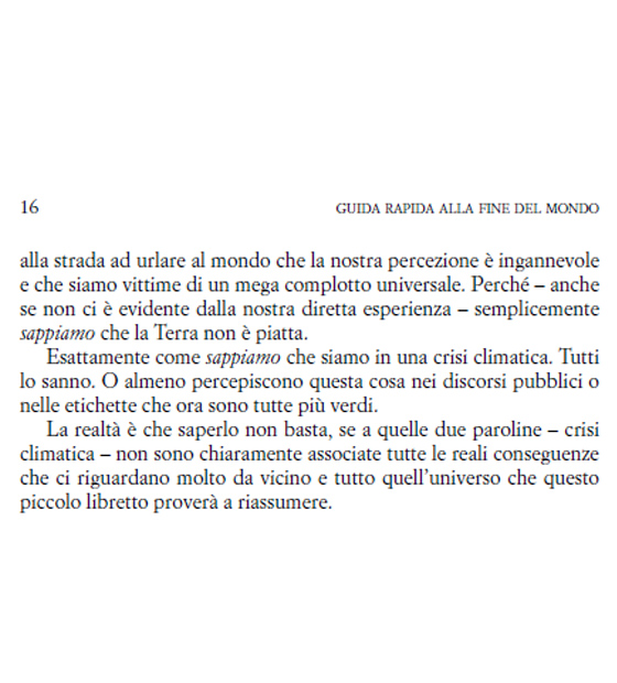 Quindi, questo libro non fa altro che dirci che la fine del mondo è prossima. Nient’affatto, non fraintendete. Per due ragioni, in sostanza. La prima, è che la guida ci rassicura spesso con delle soluzioni, che esistono e volutamente non sono scritte nella mia recensione. Sono proposte buone, realizzabili, tutto sta, appunto, nel volerle realizzare. La seconda ragione è che il mondo non finirà sia che stiamo sotto la soglia dei 2° – quando il cambiamento climatico sarà irreversibile e distruttivo – sia che la superiamo, anche di molto. Non sarebbe in ogni caso il mondo a finire, saremmo soltanto noi.