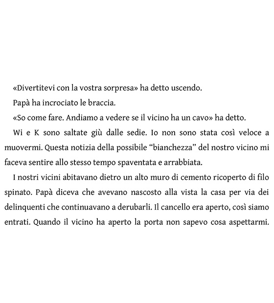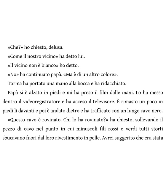 E così, sbattendo semplicemente le palpebre, degli spari possono diventare colpi di tamburo, una fuga può diventare una gara, la morte può trasformarsi in sonno. Sono giochi infantili, a cui noi, lettori adulti, possiamo giocare solo se ancora abbiamo addosso quella pura ingenuità di cui lo scorrere del tempo è solito privarci. Perché la bambina, con i suoi occhi di bambina, non può vedere le sfumature astratte di un’azione, né il percorso che la mente dell’adulto ha compiuto.