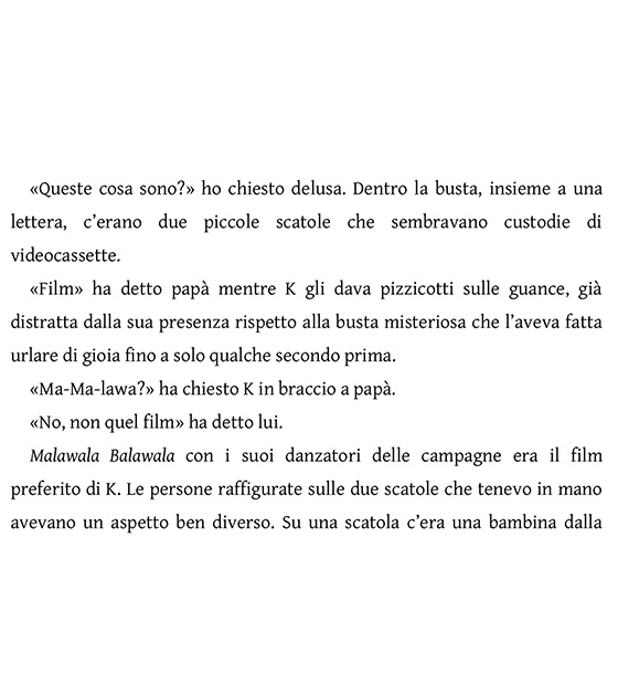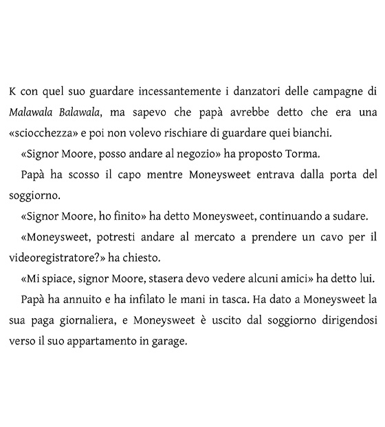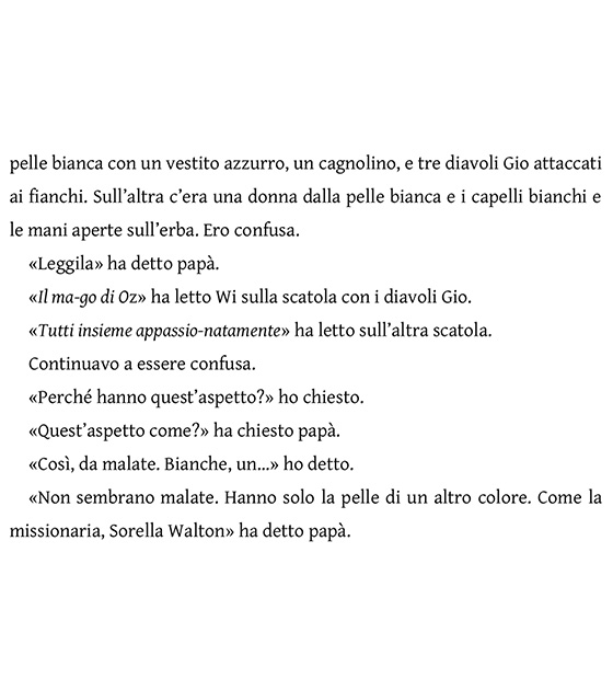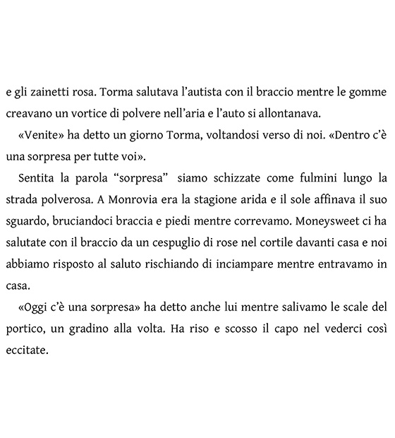 «Mi avevano convinta che la dolcezza della Liberia era ineguagliabile - più dolce dei residui di mango maturo che mi ritrovavo tra i denti dopo aver succhiato il succo di ogni pezzetto appiccicoso, più della caramella mou della nonna che mi si scioglieva sulla lingua, più del pan di zucchero, persino più dell'America - all'epoca non c'era nulla che avesse lo stesso sapore del mio paese. Questo era tutto ciò che sapevo di casa mia a quel tempo: vivevo in un posto così dolce da far cantare le parole».