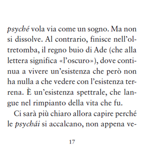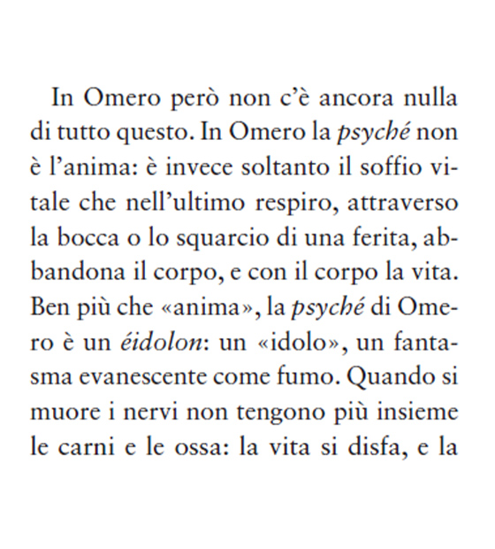 Nel libro si racconta del corpo degli uomini, e di com’è inteso – non lo anticiperò qui, ma vi basti sapere che non è una concezione tanto banale. E parla del corpo degli dei, su cui invece mi soffermerò. Perché che le divinità del pantheon greco siano antropomorfe è cosa nota, ma il nostro progressivo avvicinarci a una concezione del divino come immaterialità ci impedisce di cogliere appieno quest’assunzione. Con antropomorfo ci sembra di capire che gli dei abbiano giusto la forma degli uomini, con tutte le dovute differenze. Sono come gli esseri umani, ma sono più belli, più forti, più agili.
