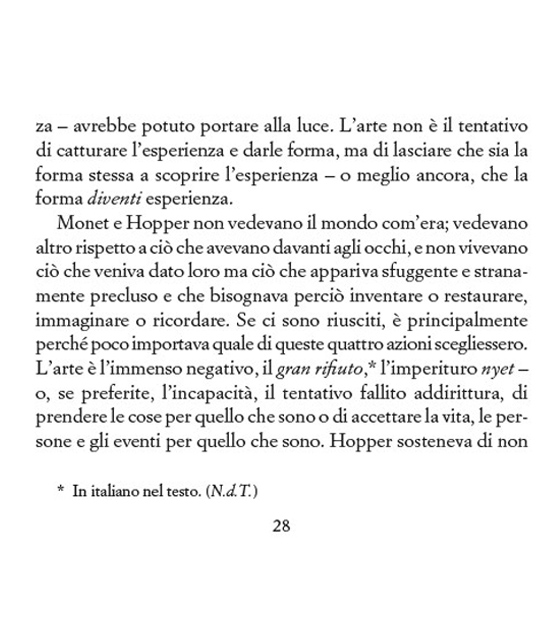 Davvero questo libro dice questo? Dice questo a me. Sì, perché la forma più portentosa del Bacio di Swann è che parla diversamente a chiunque legga. Ognuno trova le sue forme o scappa via, come nel mio caso, davanti a quest’irrequietezza seminata. Allora, i personaggi che si incontrano, che siano Freud, Monet, Kavafis, Hopper, l’illuminante e prezioso Pessoa, non sono che pezzi di un puzzle – cose che avremmo voluto capire e forse sapevamo, ma da cui scappiamo, in preda alla nostra ineluttabile nostalgia.