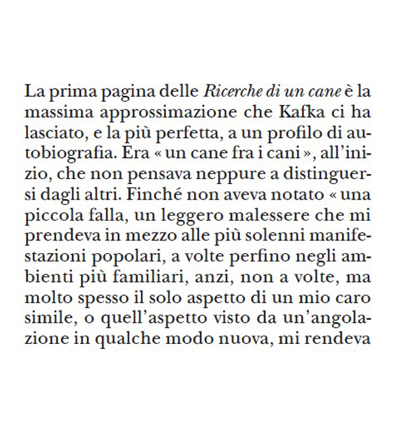 Non ha, Kafka, una tana. Cane fra i cani, ma diverso, artista che non salva, isolato ma non separato dal mondo che lo circonda. E Kafka diventa qui particolare tipo umano – antieroe, ne scrive Milena – commovente, epico nel suo schiantarsi contro una vita ai suoi occhi incomprensibile. Per lui tutto il mondo è meraviglia, cioè sempre nuovo, scoperta, luogo pieno di oggetti senza nome, ma anche esposizione, pericolo, forza incontrollata e, spesso, solitudine. È il tipo umano del narratore, che vede, legge, scruta e ancora, nonostante le sue immense biblioteche e le troppe pagine scritte, riesce a sgranare gli occhi come un bambino di fronte a una locomotiva.