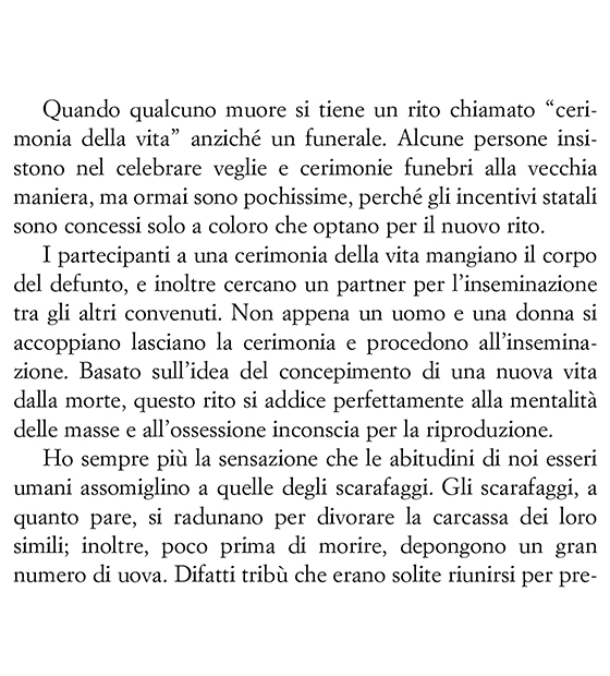 I partecipanti a una cerimonia della vita mangiano il corpo del defunto, e inoltre cercano un partner per l’inseminazione tra gli altri convenuti. Basato sull’idea del concepimento di una nuova vita dalla morte, questo rito si addice perfettamente alla mentalità delle masse e all’ossessione inconscia per la riproduzione
