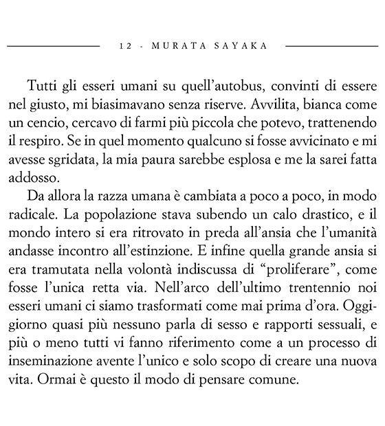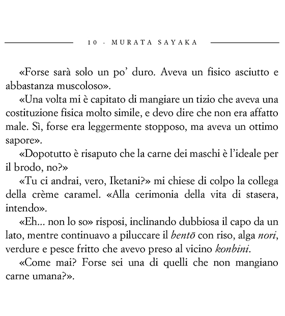 Murata riesce a trattare con la stessa folle e cruda intensità sentimenti e argomenti differenti, cogliendoti sempre impreparato e lasciandoti disturbato, ma anche affascinato, dall'assurdità di un mondo che a suo personalissimo modo riesce a parlarci di tutto.