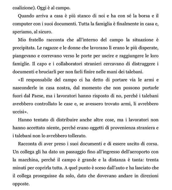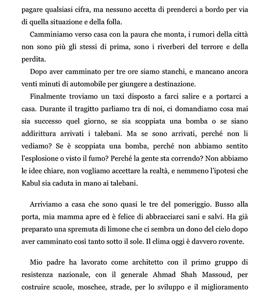In La mia fuga da Kabul l’autrice ci racconta cinque giorni di folle travaglio, per lei sicuramente interminabili, per noi che li leggiamo con il fiato sospeso, travolgenti e dal ritmo isterico.