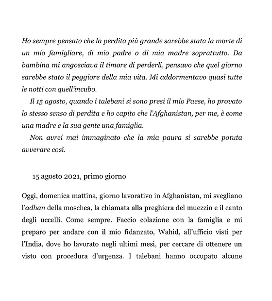 Ho sempre pensato che la perdita più grande sarebbe stata la morte di un mio famigliare, di mio padre o di mia madre soprattutto. Mi addormentavo quasi tutte le notti con quell’incubo. Il 15 agosto, quando i talebani si sono presi il mio Paese, ho provato lo stesso senso di perdita e ho capito che l’Afghanistan, per me, è come una madre e la sua gente una famiglia