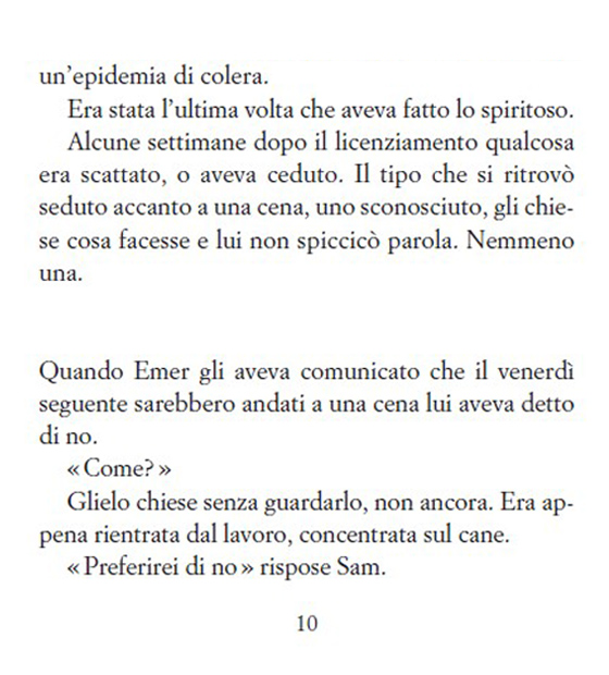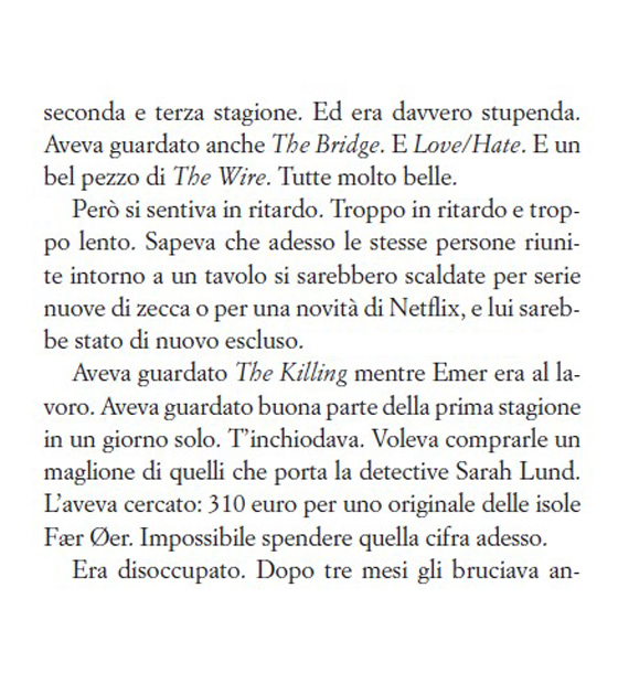 Si lava le mani per – tira a indovinare – quindici secondi. Pulisce la maniglia della porta con un asciugamano. Pulisce il manico della valigia. La apre e prende quello che gli serve – camicia, calzini. Ripulisce il manico. Lancia l’asciugamano nella vasca. Lo recupera e lo appende alla porta. Si siede sul letto. Guarda il telecomando sul comodino. Non lo tocca.