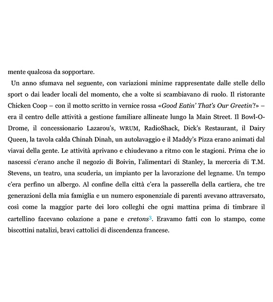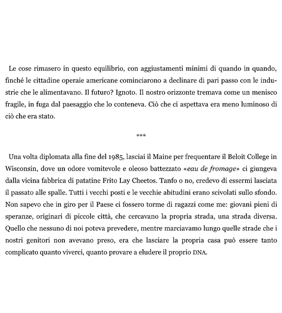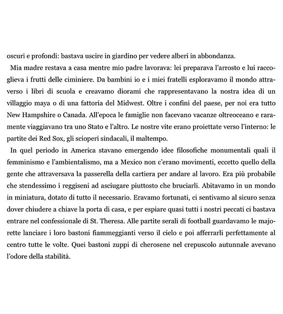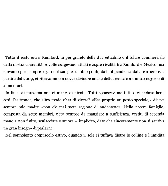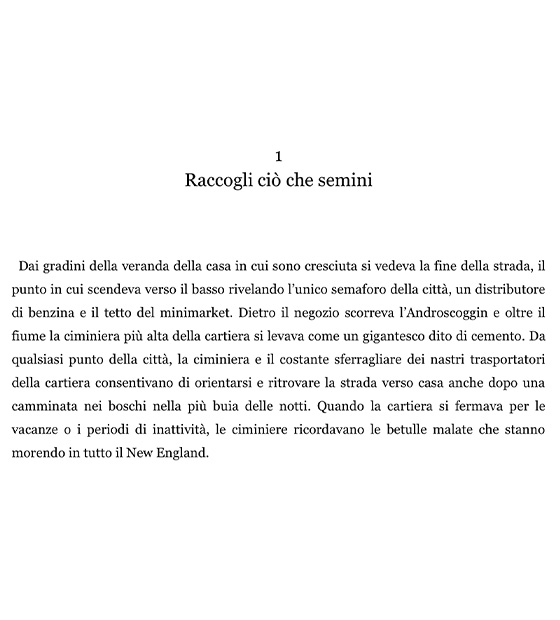 Tutto comincia con la descrizione di una città. È così dettagliata che trasuda un amore incondizionato: la si conosce a menadito, un mondo in miniatura di cui si sanno le pieghe più nascoste, dagli alberi alle anse del fiume Androscoggin, alle ciminiere della cartiera. Perché Mexico, Maine, è «la vita come dovrebbe essere», così recita il cartello che accoglie i visitatori all’ingresso dello Stato, e questa perla di cittadina ne è l’esempio più riuscito. Kerri Arsenault, a partire da questa città da cui tutto comincia, ha uno scopo preciso: indagare le proprie radici, risalendo il passato come un salmone con la corrente fin dove riuscirà.