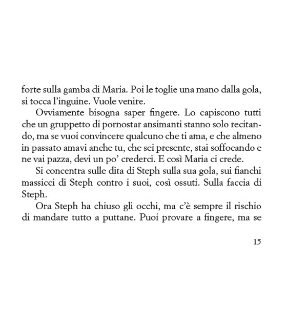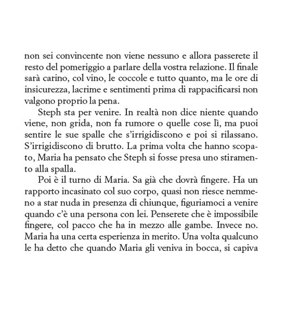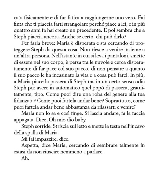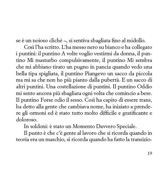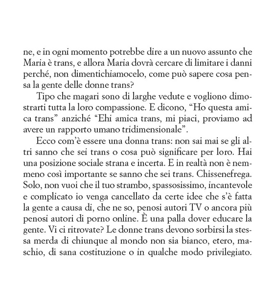 Nel libro, a nessuno frega niente che Maria sia una donna trans. A lei importa molto, invece, perché dovrebbe sentirsi parte di una comunità, perché vorrebbe avere una passera come quella della sua ragazza Steph e invece ha un pacco che deve nascondere come può, e perché, nonostante tutto quello che ha passato, non è così appagata dalla persona che è diventata. Non che pensasse che una volta fatta la transizione tutto si sarebbe risolto, eppure questo suo disallineamento tra chi è e chi vorrebbe essere diventa per lei un vero dramma.
