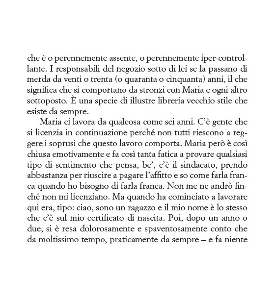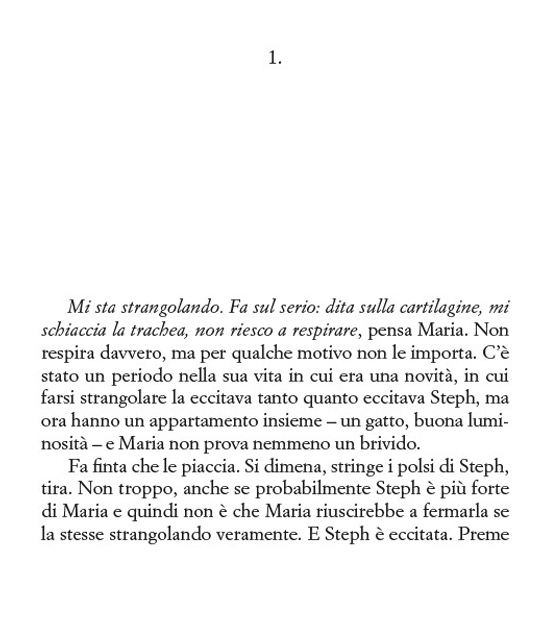 Maria è una donna trans, lo è da anni, ma questo libro non è un libro che parla della sua transizione o della sua condizione di transgender. O meglio, lo fa, ma non vi aspettate un libro sulla discriminazione, sulle difficoltà di una scelta o sui diritti LGBTQIA+: la vita di Maria è una vita, forse non come tante, ma molto più comune di quanto possiate immaginare. La forza – enorme – di questo romanzo sta qui, nella capacità di Imogen Binnie di rendere una donna trans un personaggio del tutto normale, slegato, nel suo arco narrativo, dalla sua condizione di trans, e invece raccontato nella sua sola dimensione umana.