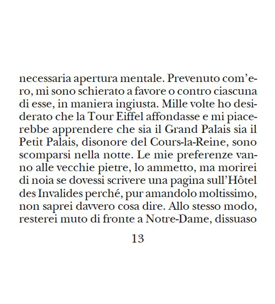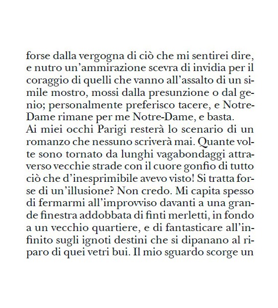 Le mie preferenze vanno alle vecchie pietre, lo ammetto, ma morirei di noia se dovessi scrivere una pagina sull’Hôtel des Invalides perché, pur amandolo moltissimo, non saprei davvero cosa dire. Allo stesso modo, resterei muto di fronte a Notre-Dame, dissuaso forse dalla vergogna di ciò che mi sentirei dire, e nutro un’ammirazione scevra di invidia per il coraggio di quelli che vanno all’assalto di un simile mostro, mossi dalla presunzione o dal genio; personalmente preferisco tacere, e Notre-Dame rimane per me Notre-Dame, e basta.
