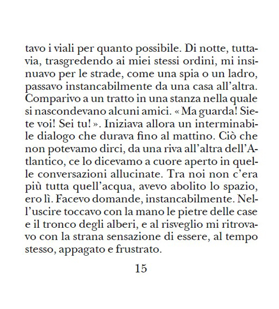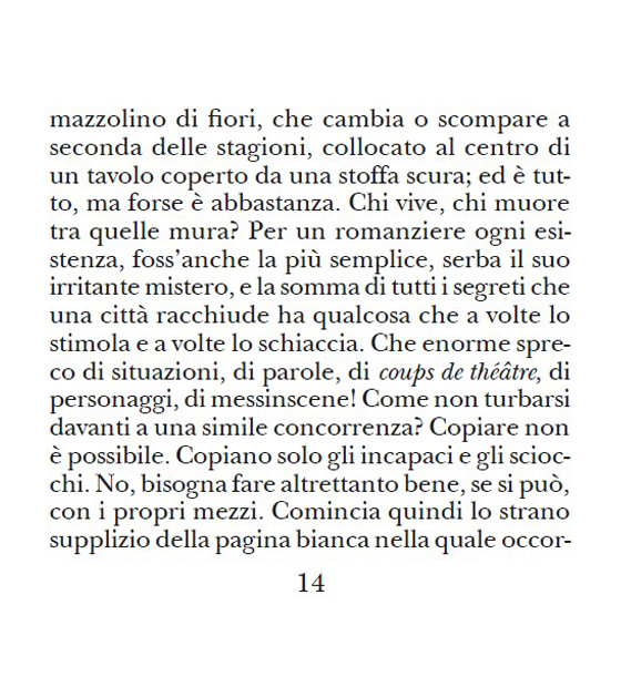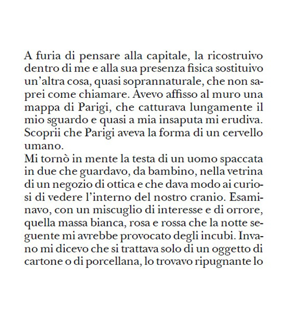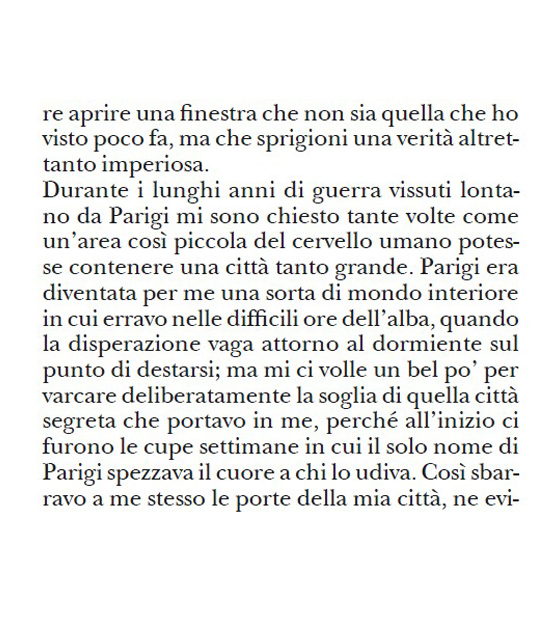 Nel camminare sotto la volta buia, tra colonne la cui simmetria, per un bizzarro effetto ottico, non riuscivo a cogliere, ebbi l’impressione di penetrare in un bosco incantato e di lasciarmi alle spalle la vita di tutti i giorni, perché uno dei privilegi di Parigi, una delle sue grazie più rare, concessa solo a chi sa perderci tempo, è proprio questo suo mostrarsi all’improvviso in una veste insolita, suscitando il piacere dell’imprevisto ma insieme anche una sottile inquietudine pronta, alla minima occasione, a trasformarsi in angoscia.