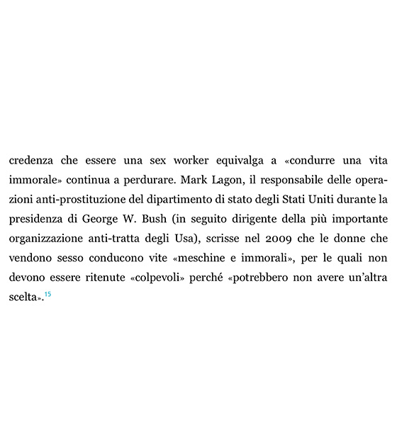 Ma l’informazione e la tenacia con cui le autrici conducono la loro indagine non priva di centralità l’aspetto che spinge l’intero libro e che ne determina le intenzioni: l’aspetto umano. Obiettivo principale è infatti l’umanizzazione di un lavoro che ha ormai assunto i connotati di un esercizio immorale e sbagliato. Per carità – viene ribadito a più riprese nel corso di Prostitute in Rivolta – nessuna delle sex worker di cui portano le testimonianze è contenta del lavoro che svolgono; certamente preferirebbero avere un altro tipo di occupazione. Ma per molte non è una scelta. Non è una scelta non solo per via delle condizioni in cui si trovano a esercitare la propria professione, ma anche e soprattutto per e limitazioni che la maggior parte dei paesi applica alle lavoratrici di questo campo.