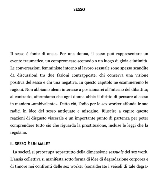 Il primo strumento che le due autrici adoperano è l’informazione. Che si tratti di modello svedese, modello neozelandese, approccio legalizzante o depenalizzazione, Prostitute in rivolta colma il divario che esiste tra la percezione fallace cui siamo troppo spesso sottoposti e fornisce a ciascun lettore le armi per affrontare una lettura consapevole e piena di spunti. Ed è proprio grazie a uno stile asciutto e divulgativo, una scrittura semplice che non forza la mano ma che conduce il ragionamento portando esempi e dimostrazioni, che questo libro diventa il punto di partenza per una comprensione civile e completa dell’argomento.